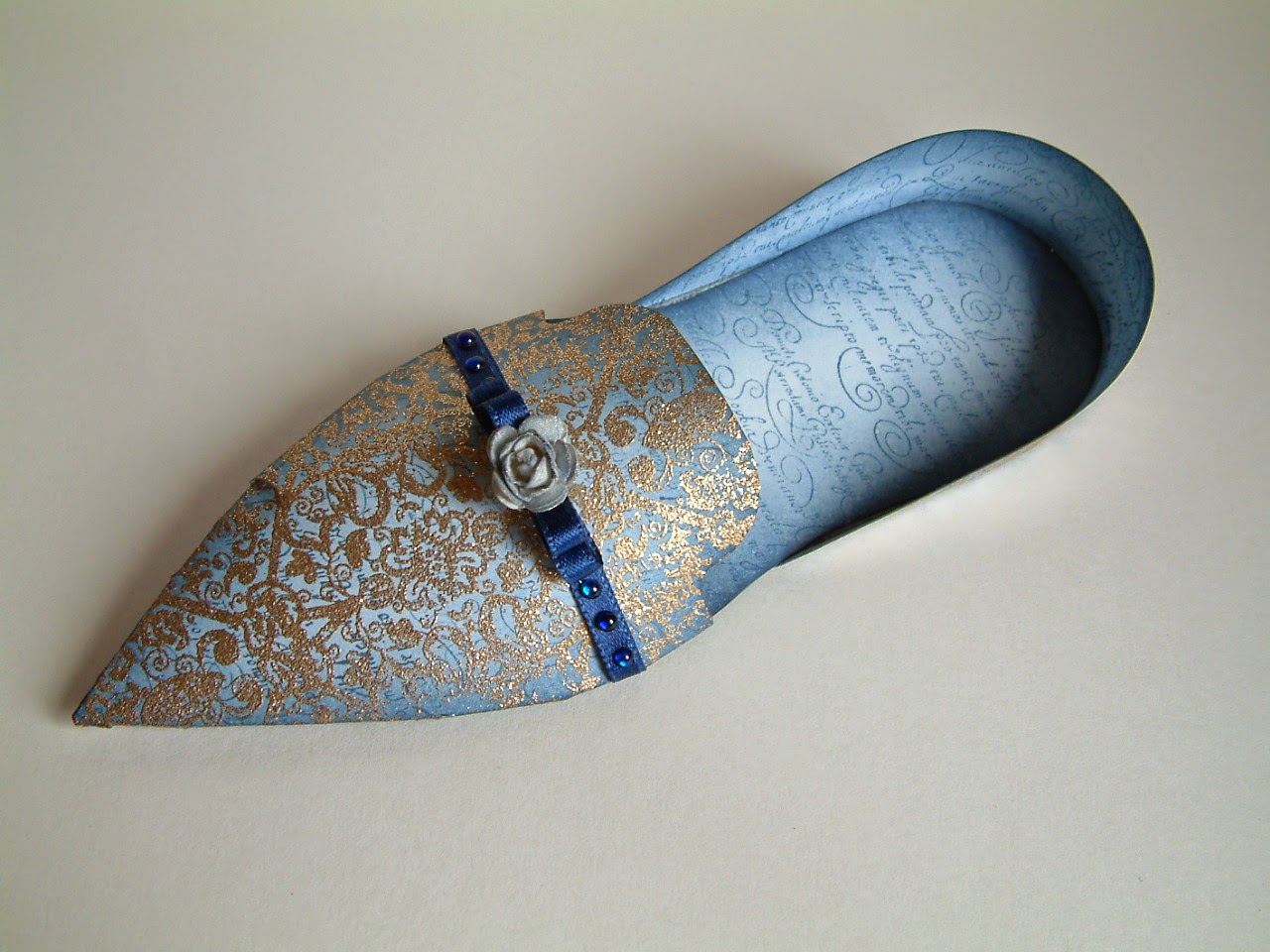 Once I had cut out all the parts needed for the shoe from plain white card I coloured them by blending Chipped Sapphire Distress Ink onto each piece, then stamped over using a script stamp from the Eccentric Edwardian theme-plate currently available from Chocolate Baroque. On the outside upper and heel pieces I over-stamped and heat embossed with a gold sparkle embossing powder (my photo only shows the gold embossing on the upper, sorry). The stamp I used was from an Elusive Images set which I seem to recall was called Damask Delights, but does not seem to be one of the designs saved by Chocolate Baroque, however they do have this very similar stamp available. Some narrow ribbon, gems and a paper rose spritzed with Glimmer Mists provided the finishing touches.